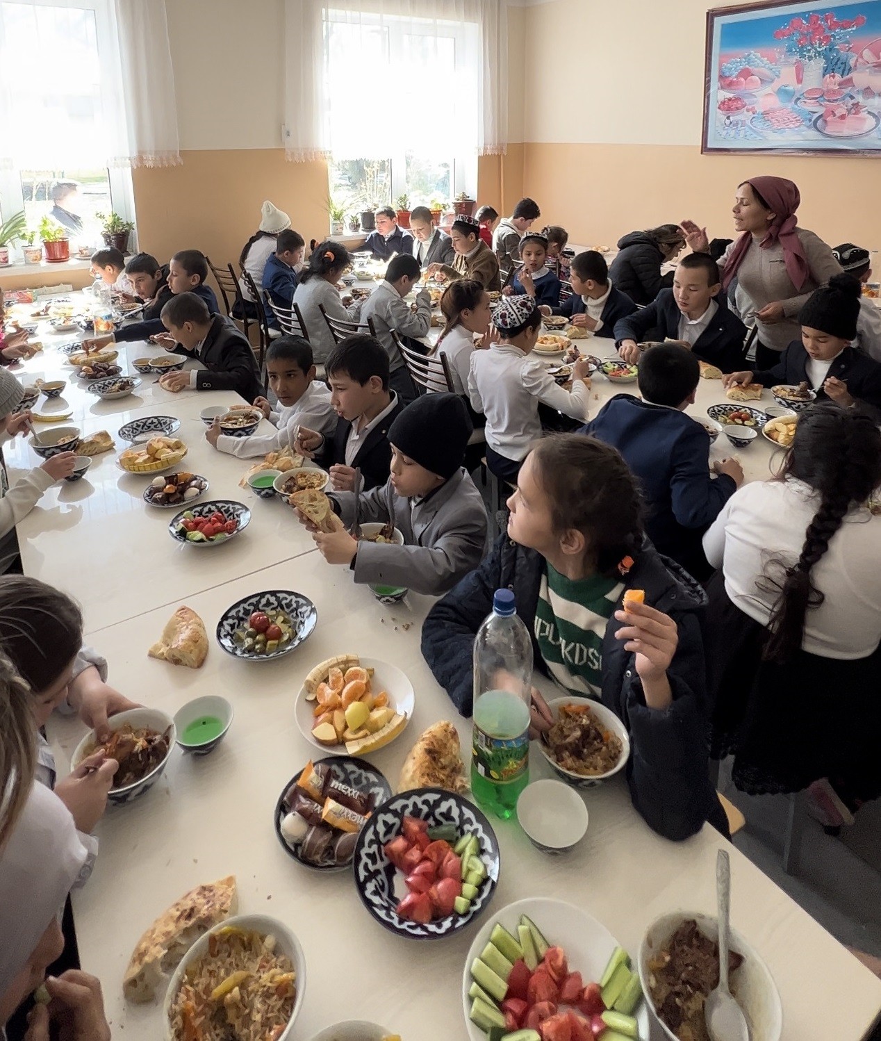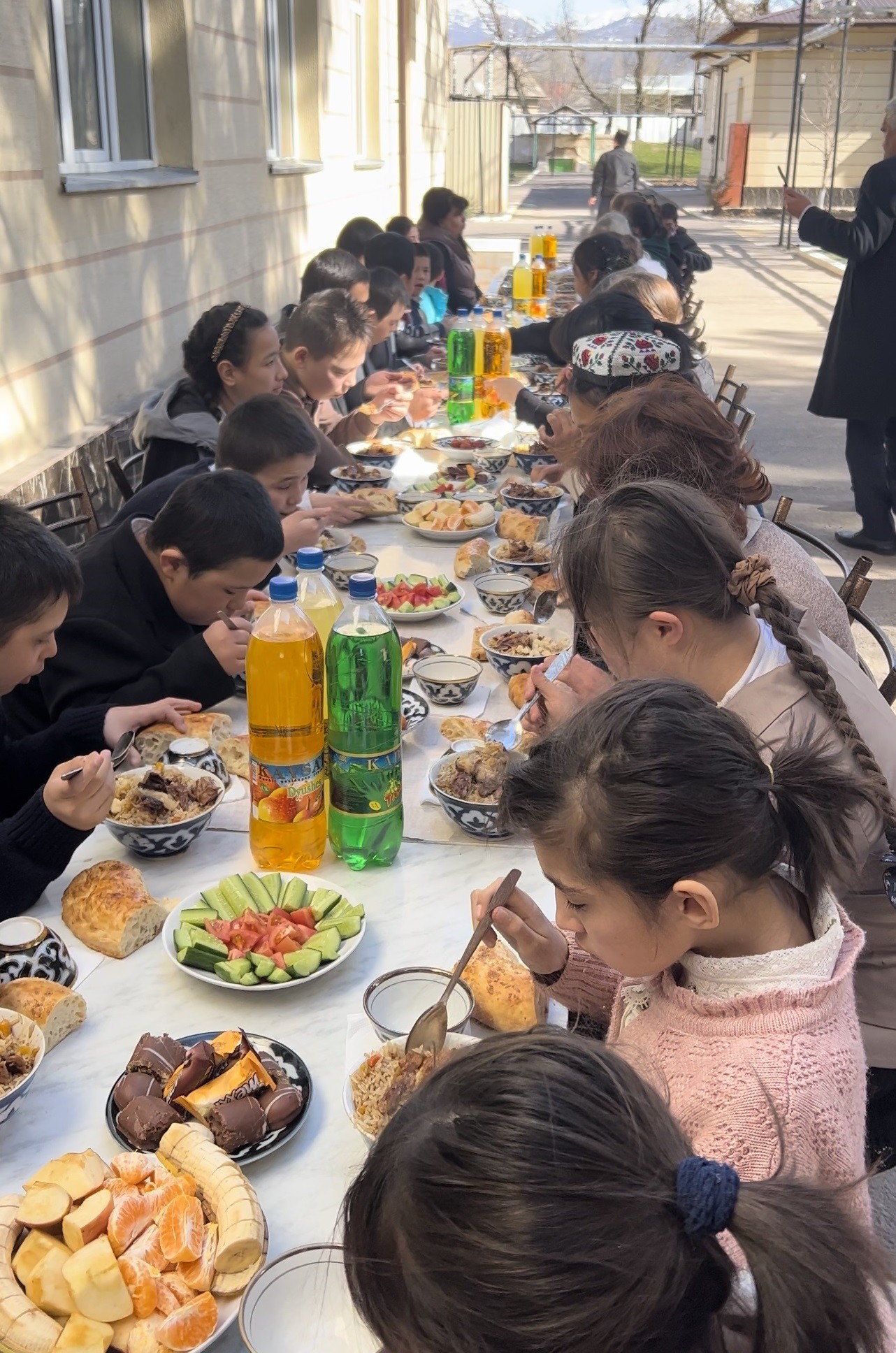 Ayni paytda direksiya xodimlari bolalar uchun palov bilan bezatilgan bayram dasturxoni tayyorlamoqda.